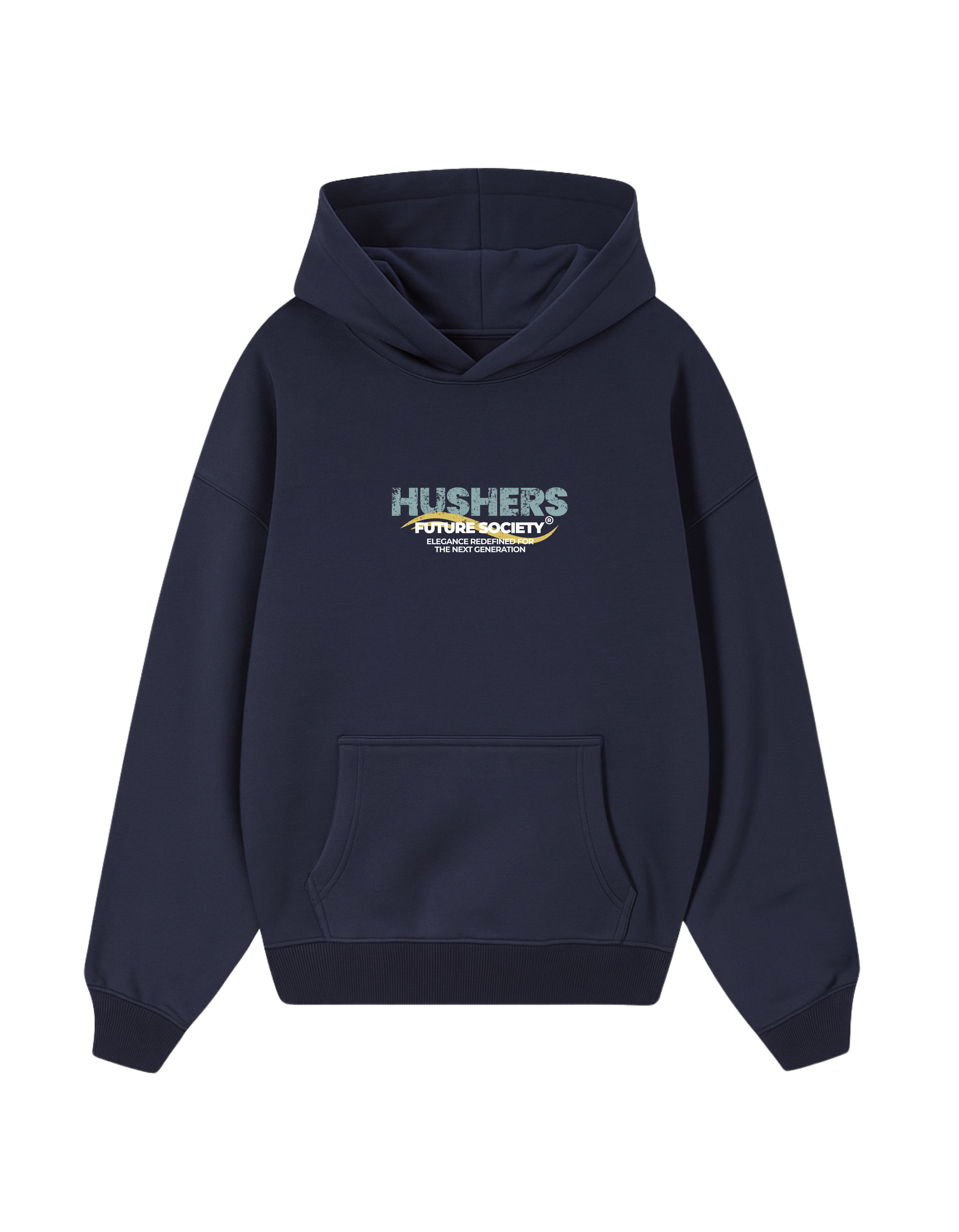 Sudadera azul marino de corte oversize, con capucha y bolsillo canguro, confeccionada con algodón premium de 320 g/m². Técnica en DTF para lograr un diseño único en detalles y colores.
