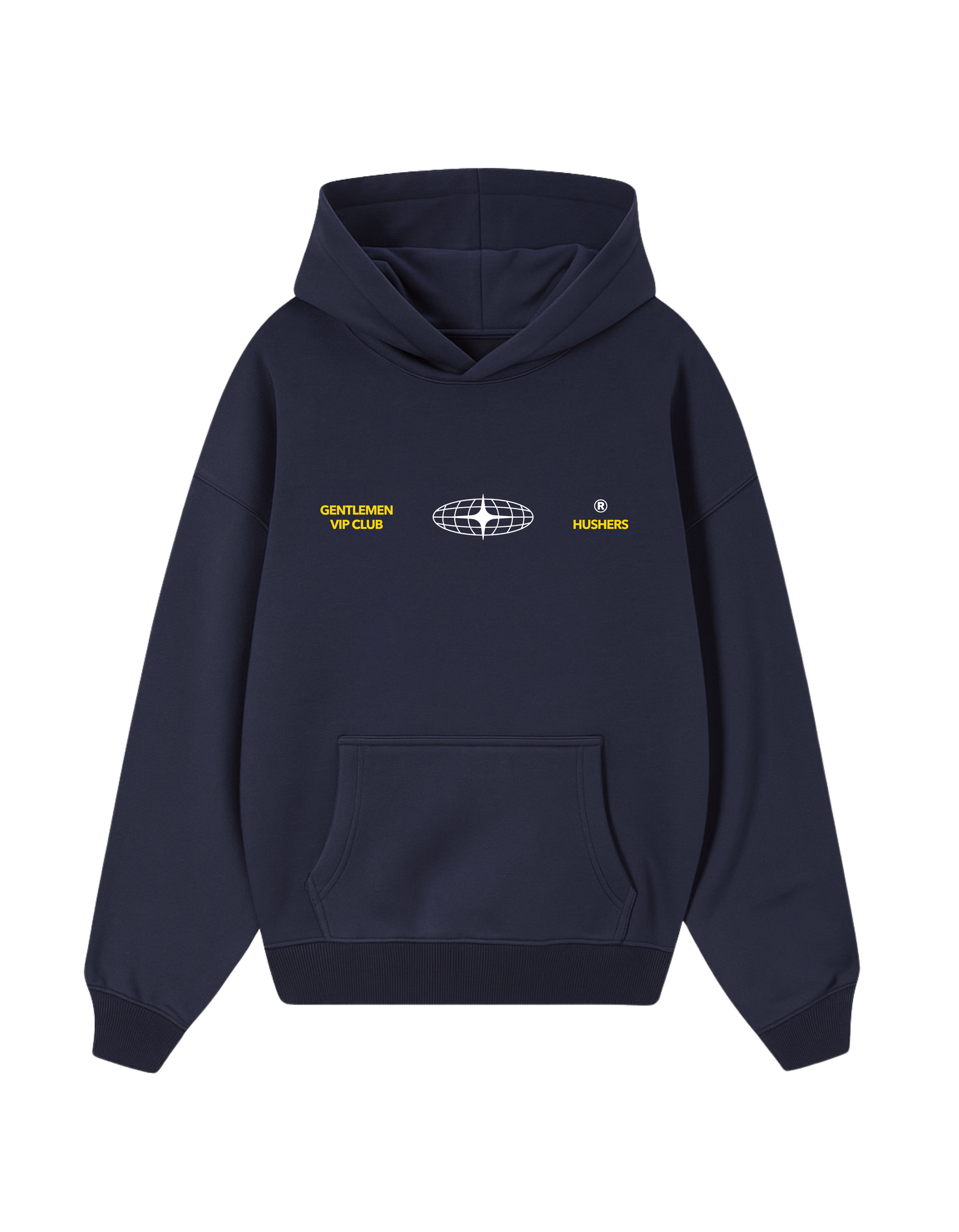 Sudadera azul marino de corte oversize, con capucha y bolsillo canguro, confeccionada con algodón premium de 320 g/m². Técnica en DTF para lograr un diseño único en detalles y colores.